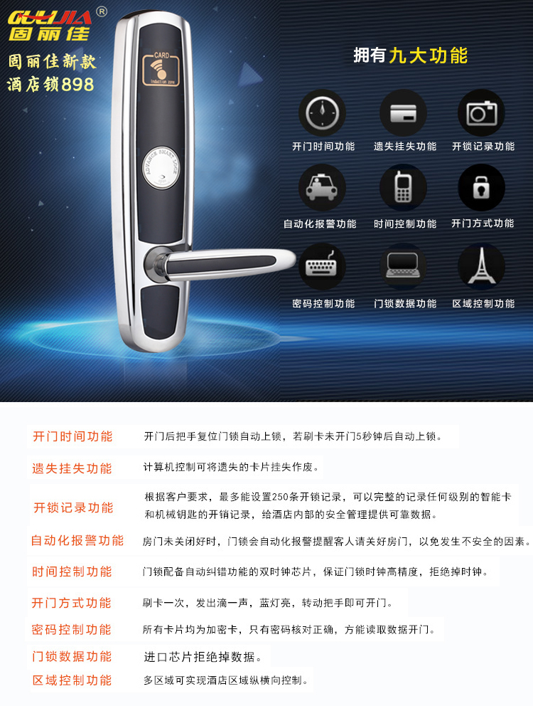 廣州錦盛商務酒店此次與我們固麗科技合作安裝了固麗佳GLJ-898FS的新款智能電子酒店門鎖,此款酒店鎖對每個細節(jié)精益求精,在莊嚴氣派中追求奢華優(yōu)雅,而融入現(xiàn)代設計手法后,則更貼近于實用性。其豪華的氣質(zhì)更是奢華與尊貴的象征,是各大星級酒店賓館首選。固麗佳酒店鎖可靠的質(zhì)量與完善的售后服務是各大酒店安裝智能門鎖的首要選擇。